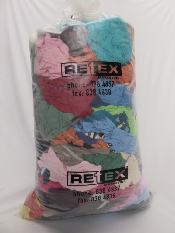 Colour knit cotton T-shirt material. A soft, low linting general purpose cotton rich wiper ideal for many applications commercially and industrial. Good for wiping and cleaning liquids, grease and oil, inks. Best suited for general maintenance, automotive, mechanical, printers.